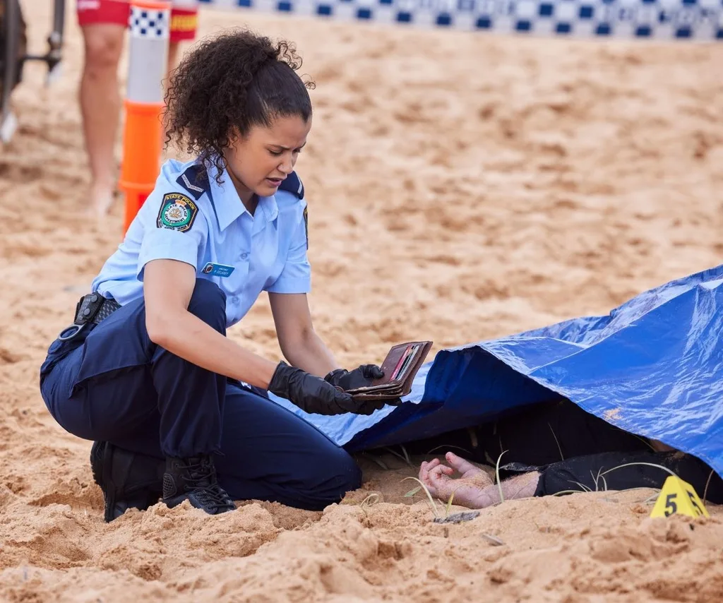 Policewoman Rose (Kirsty Marillier) arrives to assess the body, noting signs of violence, while the coroner deduces the time of death was days earlier.