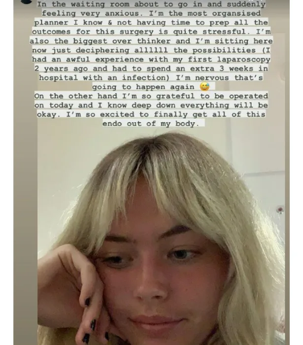 (Instagram)“I’m in the waiting room about to go in and suddenly feeling very anxious. I’m sitting here now just deciphering all the possibilities (I had an awful experience with laparoscopy 2 years ago and had to spend an extra 3 weeks in hospital with an infection) I’m nervous that’s going to happen again,” Lilly wrote.