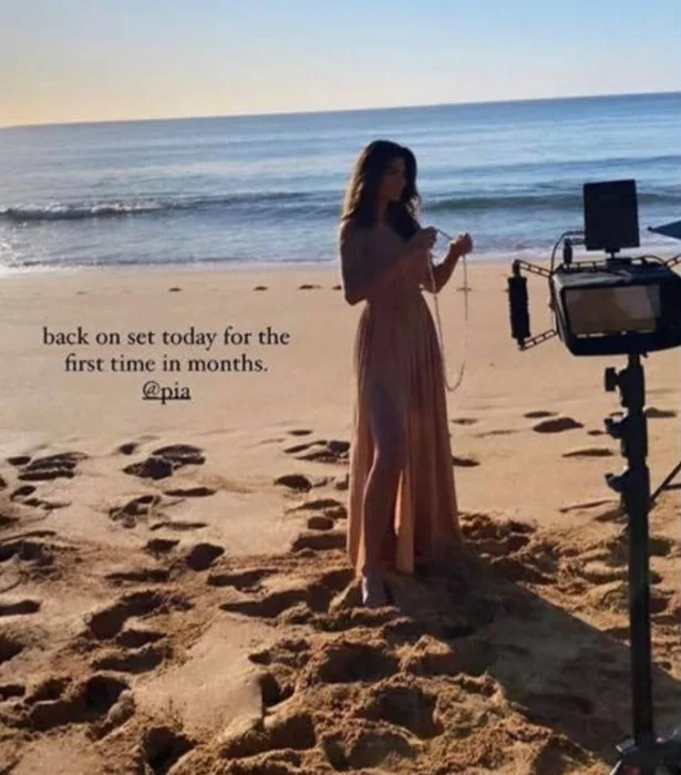 (Instagram)She then posted a second photo of herself on the beach in front of a camera, further adding fuel to the frantic fire by captioning: “”Back on set today for the first time in months.”