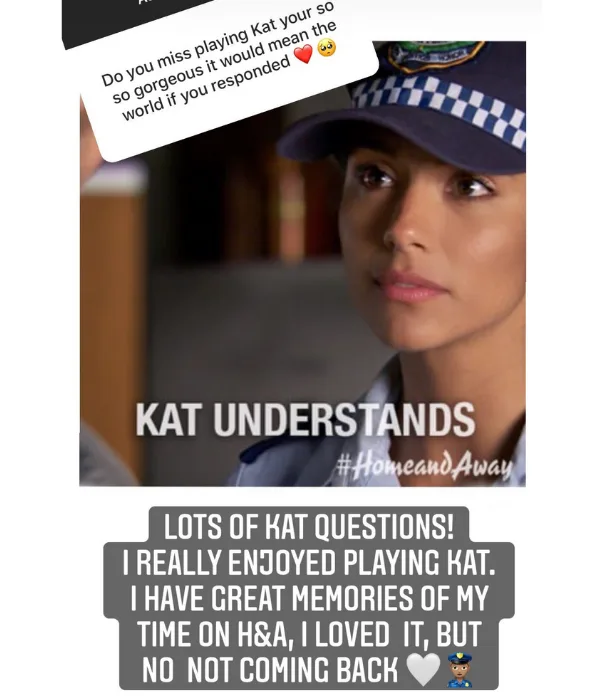 To which she sadly responded: “Lots of Kat questions! I really enjoyed playing Kat. I have great memories of my time on H&A, I loved it, but no not coming back.”