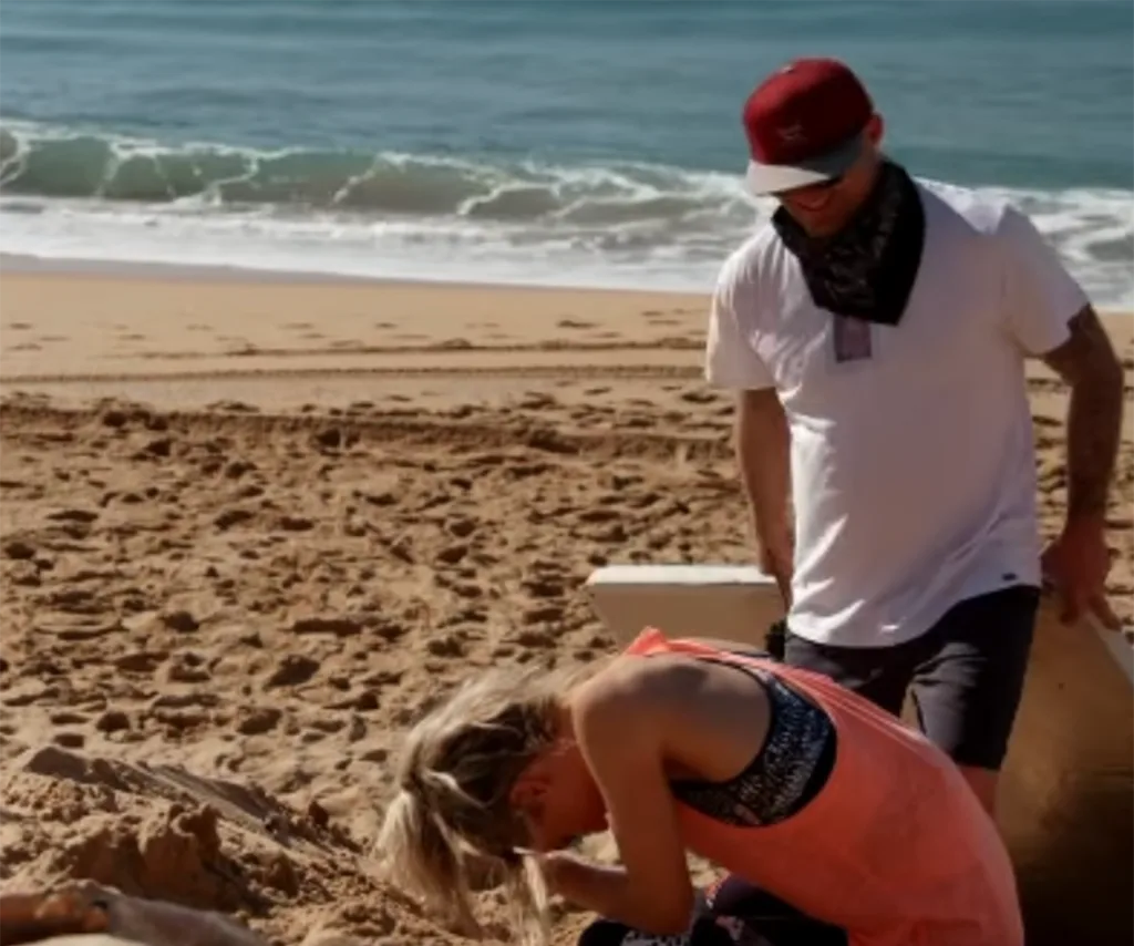 As Sam went to walk away she took a bad stumble on a sandbank, prompting the crew to erupt with laughter.