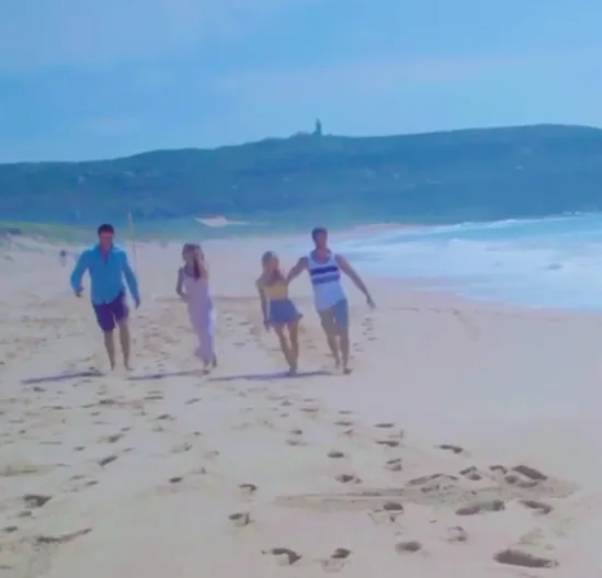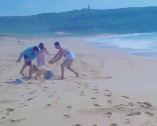 Not realising just how much smaller Sam’s stature is, instead of receiving said nudge with a little reflex, the actress goes flying across the sand.
