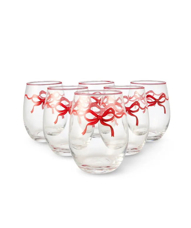 Bring holiday cheer to your table with this set of 6 bow-accented stemless glasses. Their sleek silhouette and playful detailing make them ideal for serving festive drinks with style.