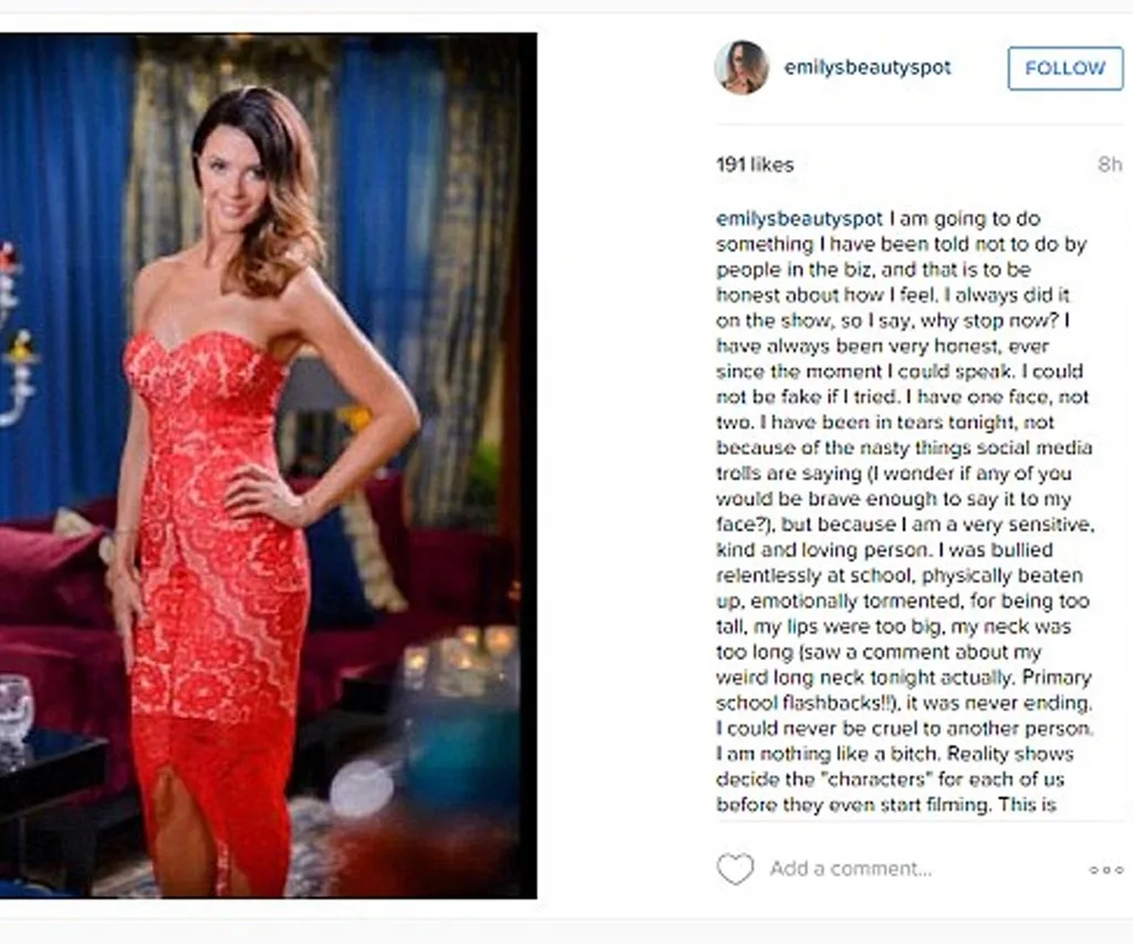 Emily continued her venting session: “Soooo many hours of footage, and all they choose to show of me is that I found Heather annoying. I am so grateful for the amazing friendships I’ve formed because of this show, and the worst part about being on this show for me so far is to realise how many nasty, unintelligent people there are in the world, who actually believe everything they see on a reality show, and then feel the need to write nasty things about all of us.”