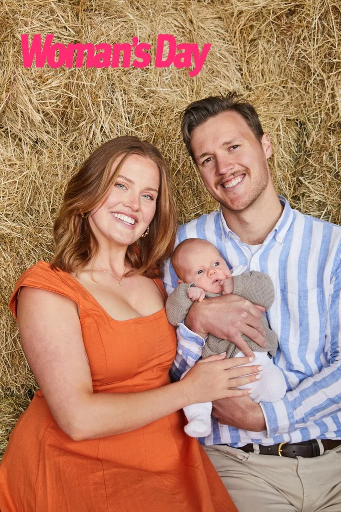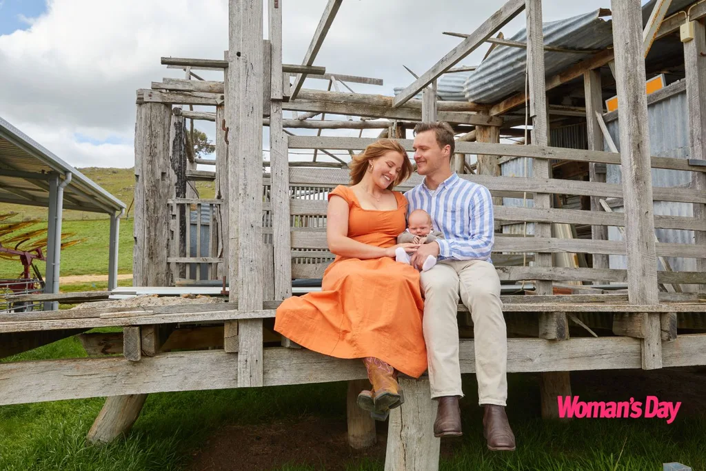 “It’s been really nice just nesting down for those first few weeks,” proud dad Matt says of settling into their new life as the couple pose at his family’s farm in Bookham, NSW.