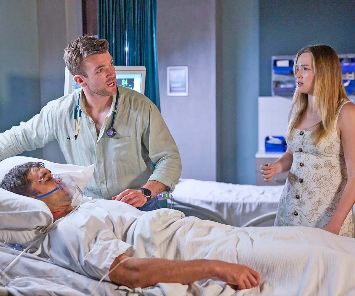 A few hours later, at the hospital, Levi (Tristan Gorey) is stunned to see paramedics rushing Tane in on a gurney. He has severe injuries to his abdomen and needs urgent surgery. As Levi preps him, Jo (Maddison Brown) arrives and rushes to his side, guilt consuming her for not being with Tane throughout this ordeal.