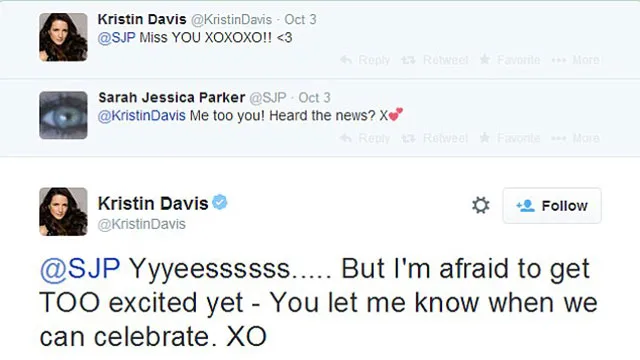 After this initial statement had fans getting excited, two of the franchises main stars – Sarah (who plays Carrie) and Kristin Davis (who plays Charlotte) posted this highly suggestive exchange on Twitter- for all the world to see:
