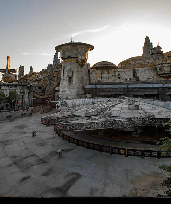 The 100-foot-plus full-scale replica of the Millennium Falcon at Disneyland’s Star Wars: Galaxy’s Edge.
