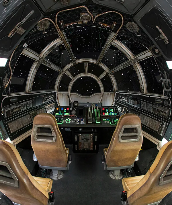 The cockpit of Millennium Falcon: Smuggler’s Run at Star Wars: Galaxy’s Edge, Disneyland.
