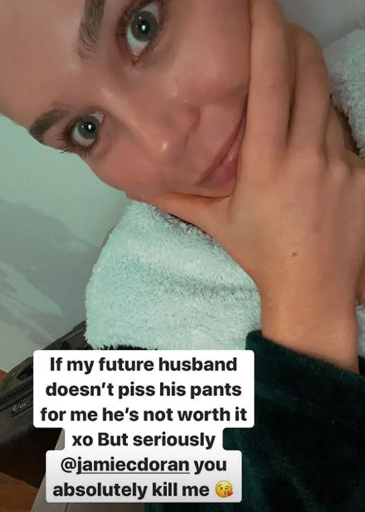 “If my future husband doesn’t piss his pants for me he’s not worth it xo.” she joked adding, “But seriously @jamiecdoran you absolutely kill me,” alongside a kiss face emoji.
