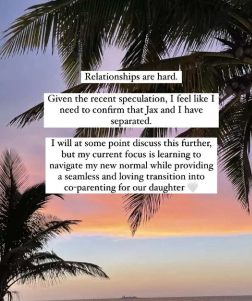 (Image: Instagram)The post read: “Relationships are hard. Given the recent speculation, I feel like I need to confirm that Jax and I have separated.”