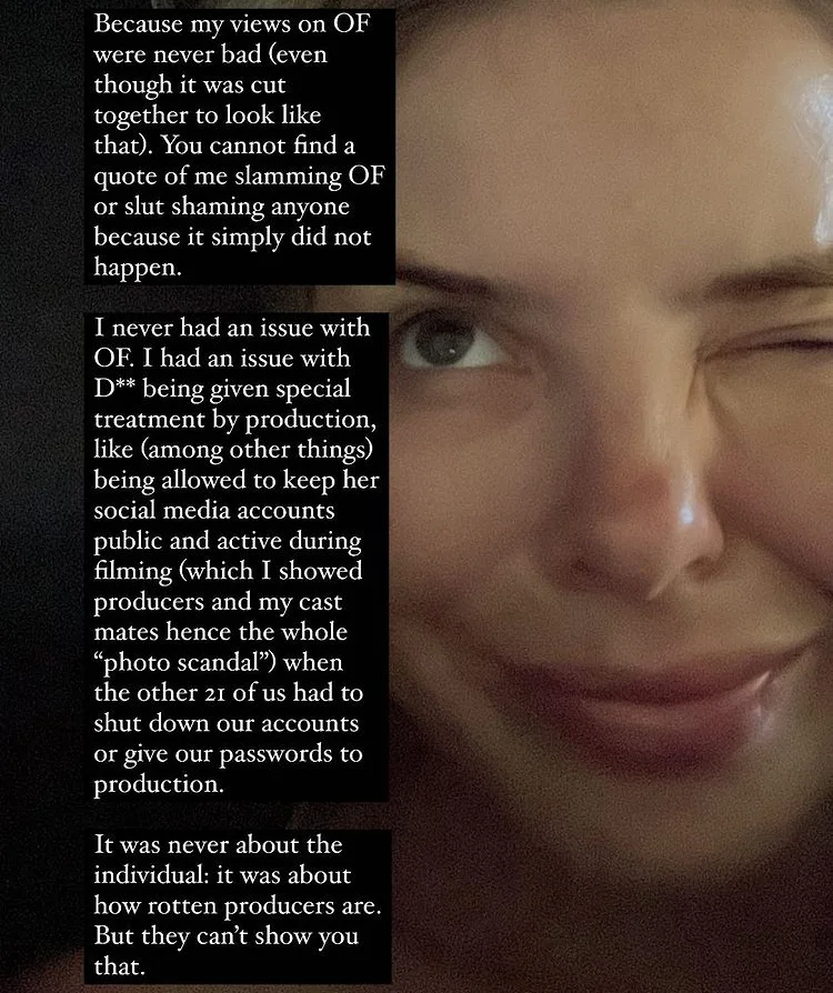 “(Which I showed producers and my cast mates, hence the whole ‘photo scandal’) when the other 21 of us had to shut down our accounts or give our passwords to production.”