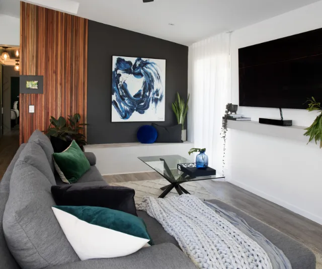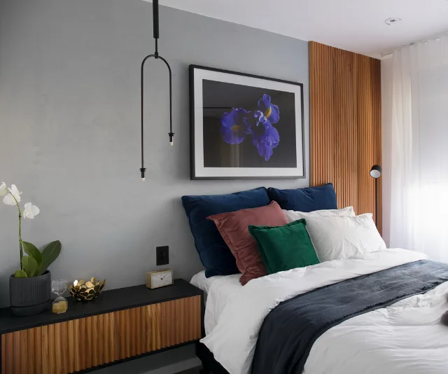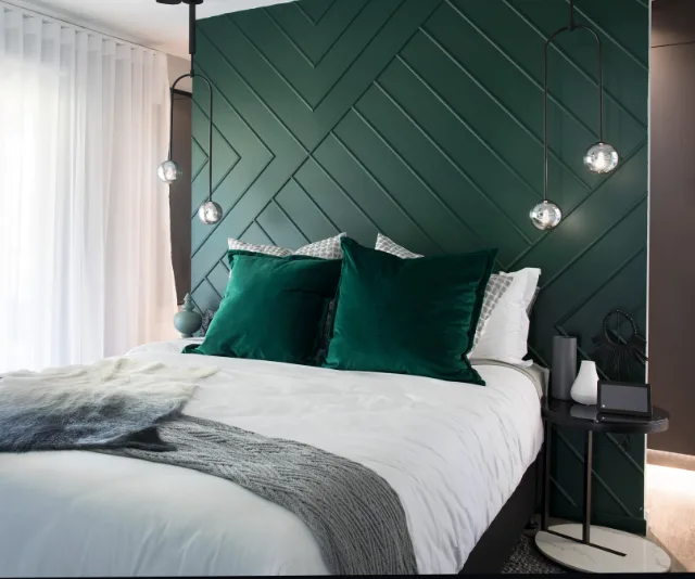 Tanya and Dave managed to win the judges over in their bedroom with their asymmetrical timber feature wall and jewel toned finishings.