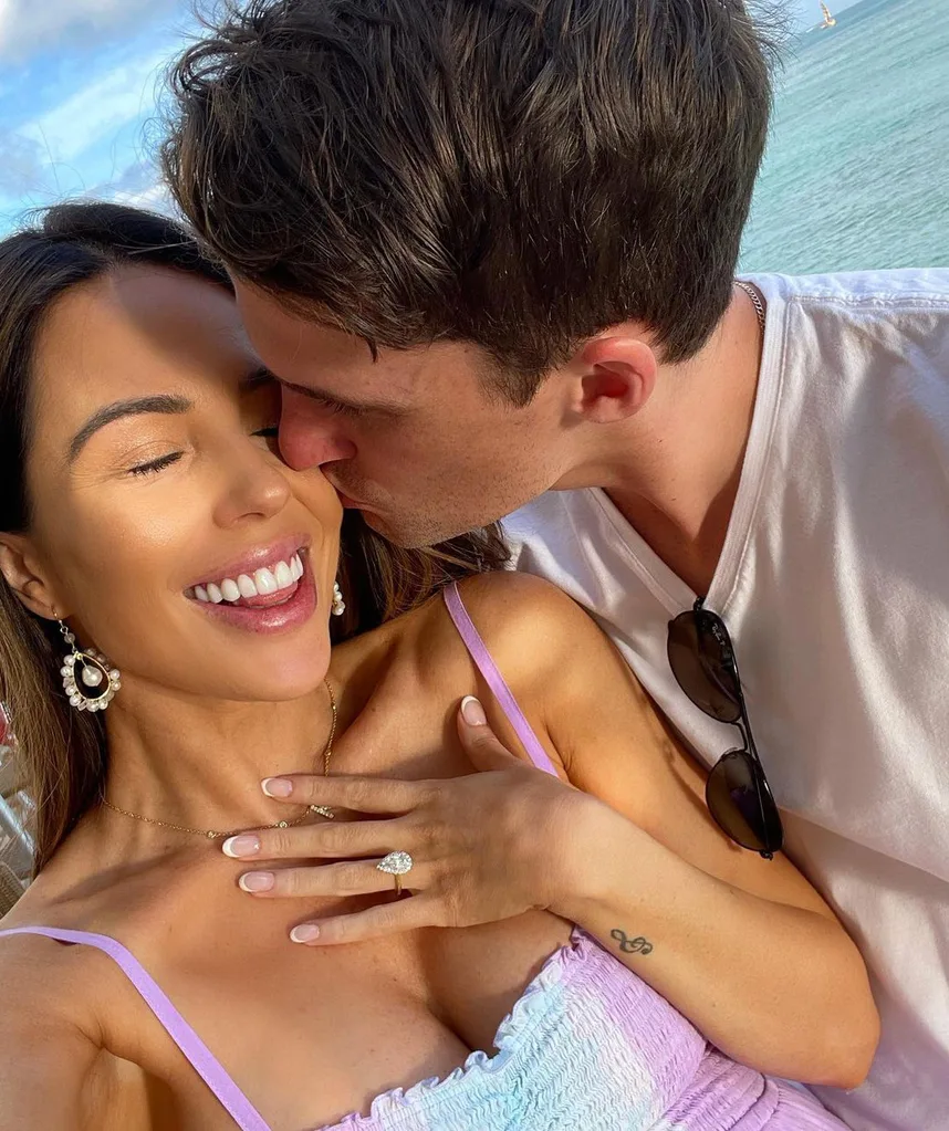 Sharing the news on Instagram on Monday night, the proud bride-to-be showed off a stunning pear-cut diamond ring surrounded by a halo of smaller stones.