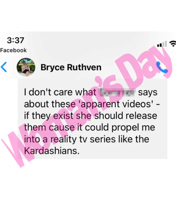 In a text message obtained by Woman’s Day that Bryce, 31, sent to a friend five years prior to his MAFS season, Bryce Ruthven addresses alleged sex tapes doing the rounds among his friends, saying they should be leaked so he can land his own reality show.