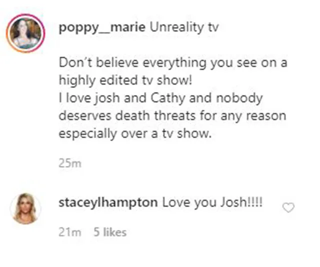 “Don’t believe everything you see on a highly edited TV show!” she captioned the video. “I love Josh and Cathy and nobody deserves death threats for any reason, especially over a TV show.”