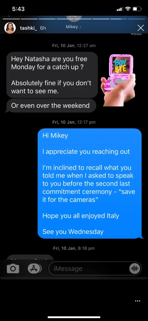 (Image: Nine Network)The reunion was filmed back in January, but in texts shared on Natasha’s Instagram stories, Mikey reached out to his ex ahead of filming.