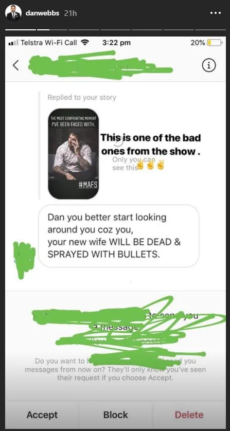 (Image: Instagram @danwebbs)Another message told the father-of-one to “keep your mouth shut you bogan loser”.