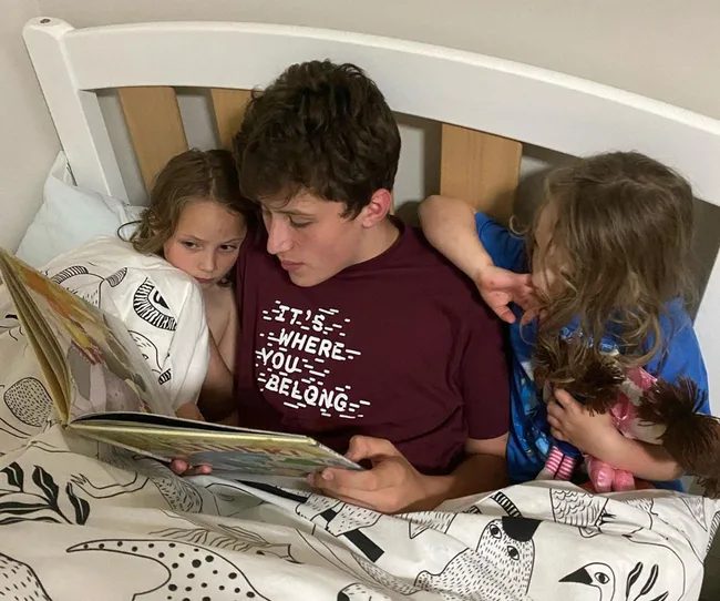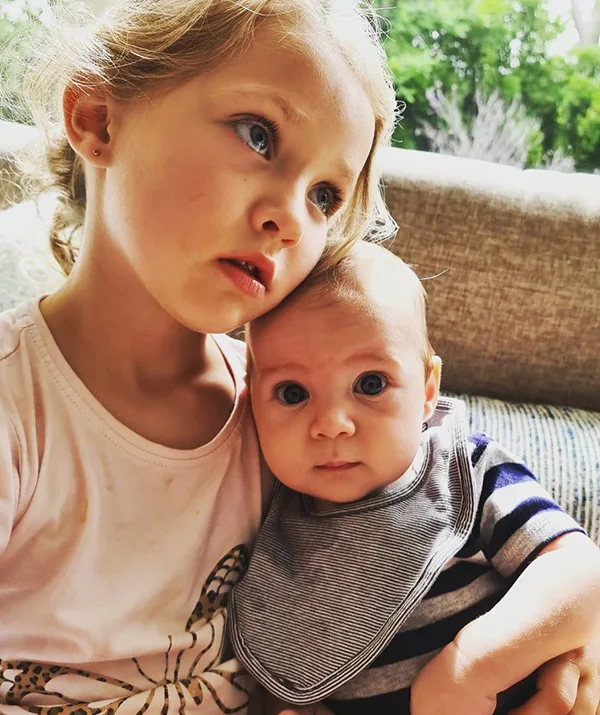 “He’s the easiest baby I’ve ever had and he’s tolerant of being squished by the girls!”