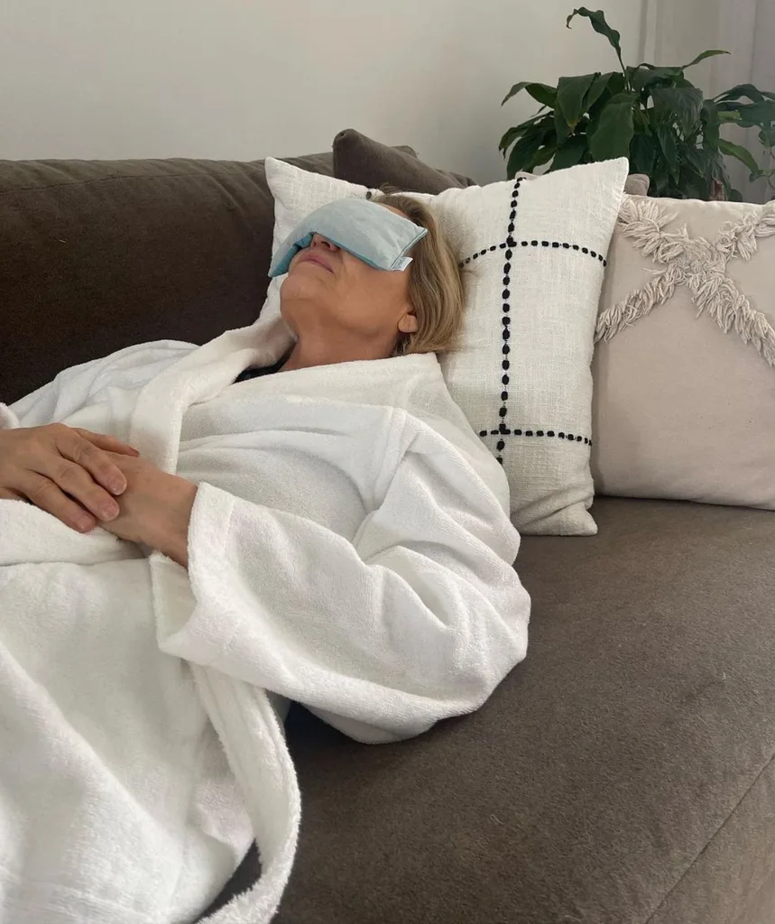 The 59-year old uploaded a candid picture to Instagram of her fighting COVID-19 with a comfortable white robe and face covering.