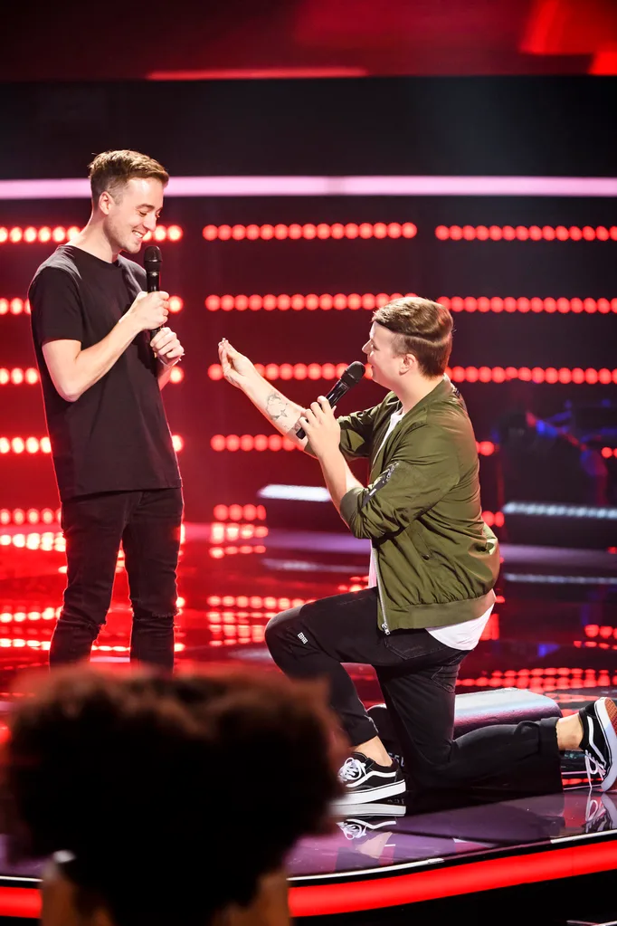 The Voice contestant Nathan pops the questions to Mitchell.