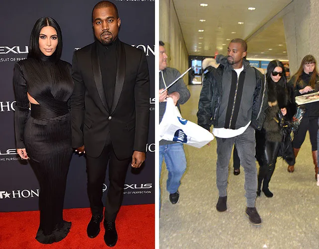 Left:Kim and Kany in matching outfits at the BET Awards. Right: Leaving the aiport in Washington with Kim as fans asked for autographs, moments later, Kanye could be seen bursting into laughter!