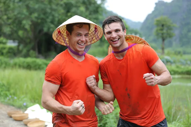 They appeared destined to win, but despite coming first in eight of the 10 legs, footy mates Tyler and Tom fell at the penultimate hurdle. Forced to complete two challenges instead of one, they failed to qualify for the final by just seconds.