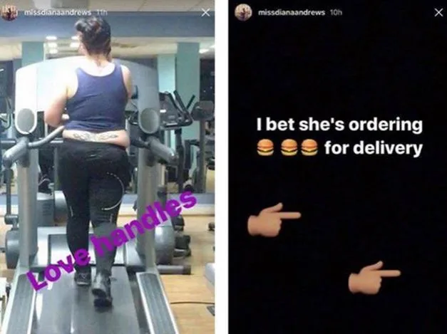 UK bodybuilder Diana Andrews took it upon herself to share a picture of a woman running on a treadmill in front of her with 17,000 Instagram followers along with a caption that read: “love handles”.