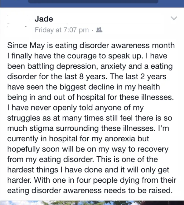 Jade was admitted, she complied with hospital feeding, and told the psychologists what they wanted to hear and was discharged shortly after. Hospitals heal sick bodies, once a person with an eating disorder is deemed stable they are released unless they are close to death. Often, this is too late.