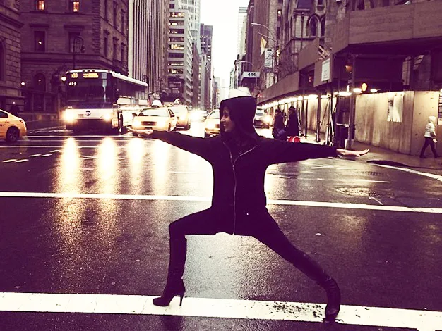 Alec Baldwin’s wife has literally stopped traffic in New York, photographing herself pulling a yoga pose on a busy street.