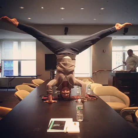 Getting bendy at a business meeting: Hilaria stretches on a table in a boardroom.