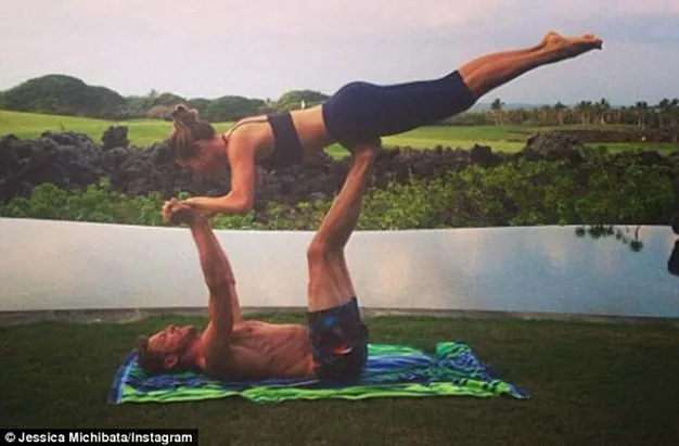Jensen Button’s girlfriend Jessica Michibata posted the pictures of the buff and bendy pair trying out a series of yoga exercises together.