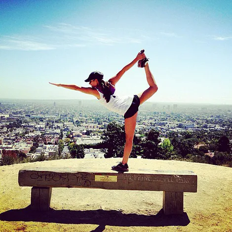 So Zen: Glee star Lea Michele stretches on her hike atop the Hollywood Hills.
