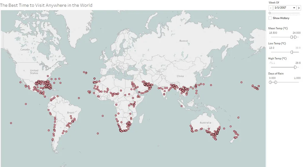 So how does it work? Well, you simply select the week you want to travel, your ideal mean, low and high temperatures as well as ideal rainfall then click the magic button and pink dots will appear for the locations that suit your preferences.