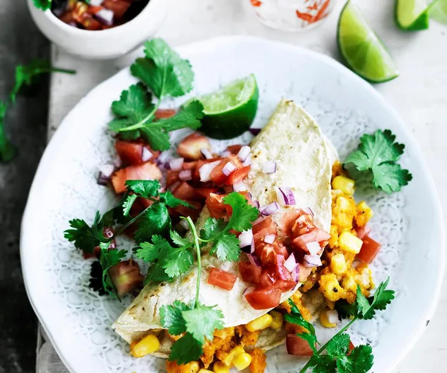 Pumpkin and corn quesadilla with fresh tomato salsa