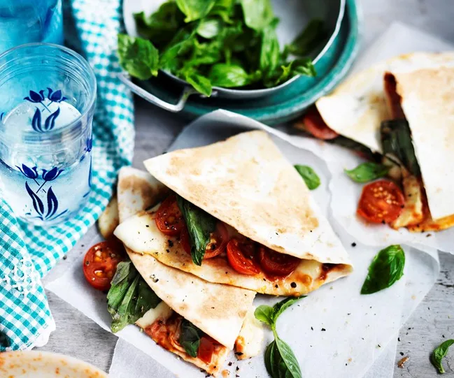 Creamy bocconcini, fresh tomato and basil sandwiched between toasted tortillas for a fresh and tasty lunch idea. Pizza flavours in a simple quesadilla.
