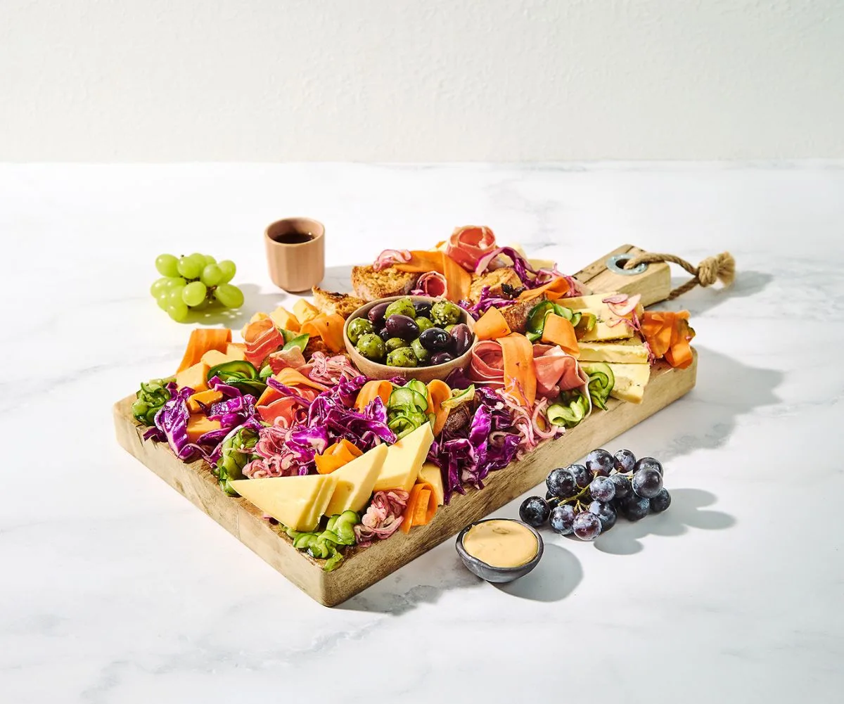 - Make up the board using olives, grapes, Australian cheeses, prosciutto, salami and chorizo.