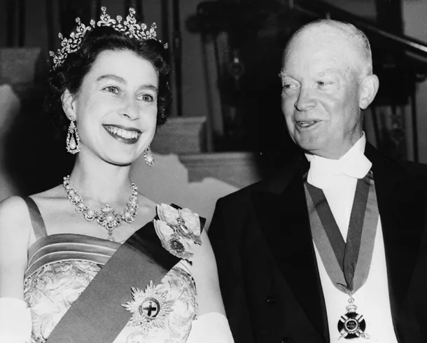 Queen Elizabeth II and President Dwight Eisenhower at a White House State banquet in 1957.