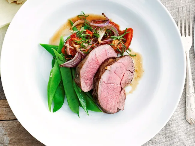An Aussie lamb rump roast will tantalise the tastebuds, and it’s served with a fragrant grilled tomato salad and steamed greens.