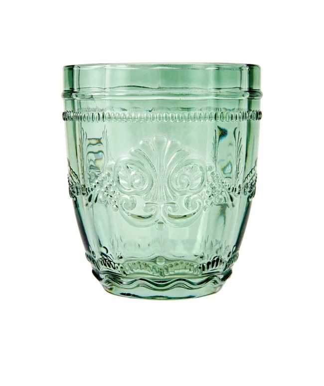 Elevate your table setting with this glass set. The intricate design and soft green hue offer charm and style while enjoying your favourite beverage.