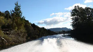 This is the site of a new geothermal power plant and when he’s not painting strange grimaces on our faces as the G forces send our cheeks somewhere back near the stern, our guide explains how the power plant has hit the steam equivalent of gold and if it continues to come out as it is right now it could provide Auckland with a quarter of its power.
