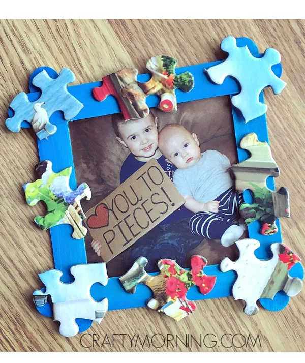 Glue four coloured craft sticks together to make a square frame shape. Glue on some puzzle pieces. Set up a cute photo op with your kids holding a sign with a Heart You To Pieces! sign and pop it in the frame.