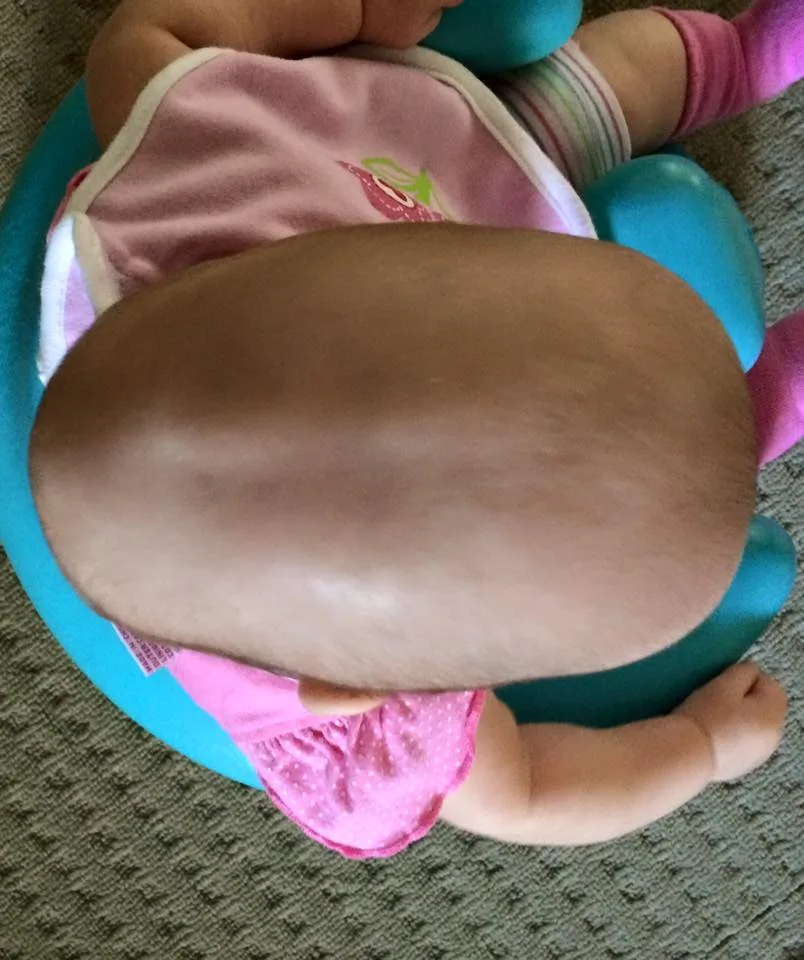 The only treatment for her little girl was to undergo major surgery. This entailed removing her scalp, cutting the skull away, removing and remodelling her forehead and her occipital bone (rear of her head) – all at five months old.