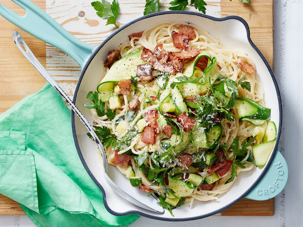 This grain spaghetti with bacon, zucchini and parmesan is lip-smacking and satiating – a perfect combo for a busy, breastfeeding mum.