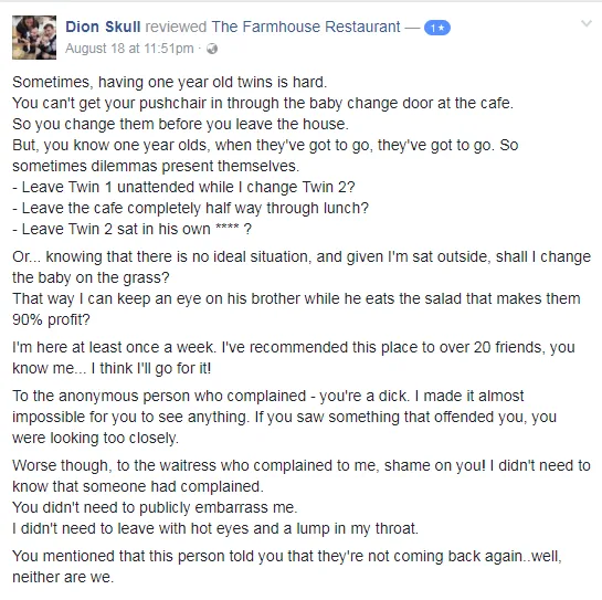 A mother of twin boys has lashed out at The Farmhouse Restaurant in Guildford, UK, after the restaurant manager allegedly berated her for changing her child’s nappy in a seating area outside.