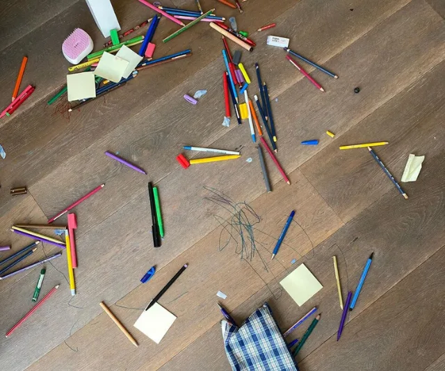 “ISO LIFE. Every time we tidy a room they destroy it,” Carrie wrote on Instagram alongside the photo above, showing stationery all over her floors.