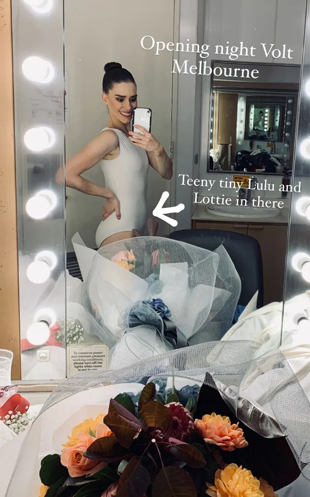 “Opening night Volt Melbourne. Teeny Tiny Lulu and Lottie in there,” the 34-year-old penned, drawing an arrow to her stomach, which shows just the smallest hint of a bump.