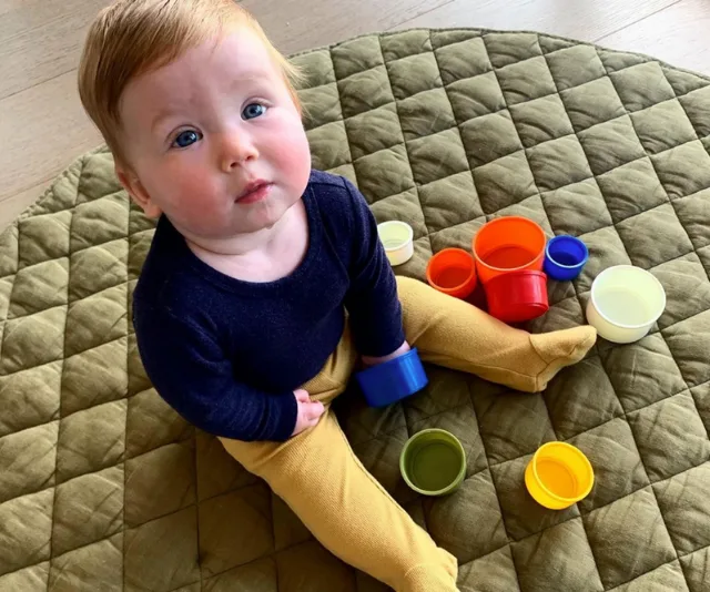 The latest pic, however, has followers even more enamoured, with Edwina sharing a side-by-side comparison to her own baby photo, playing with the very same building blocks.