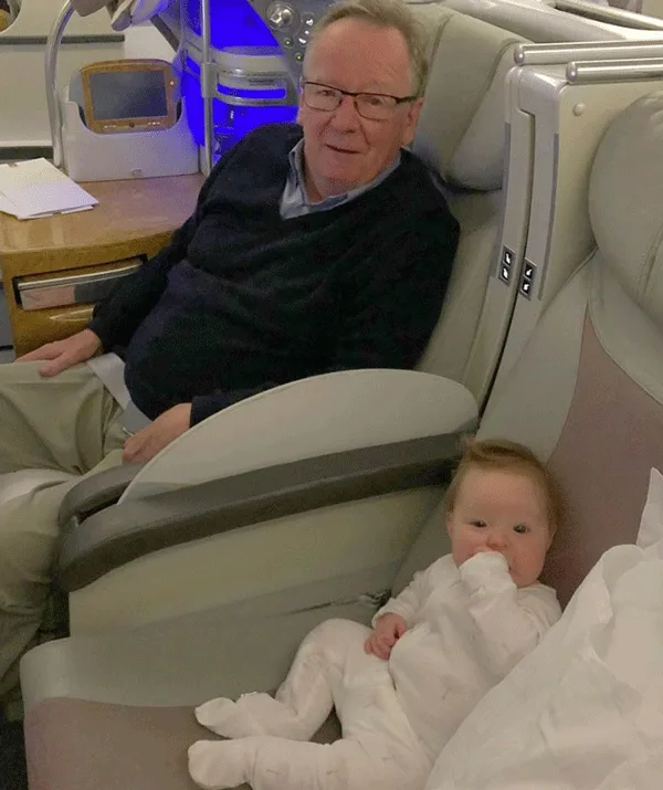 On grandad duty! Fifi’s dad provides the inflight entertainment to his grandaughter, Daisy.