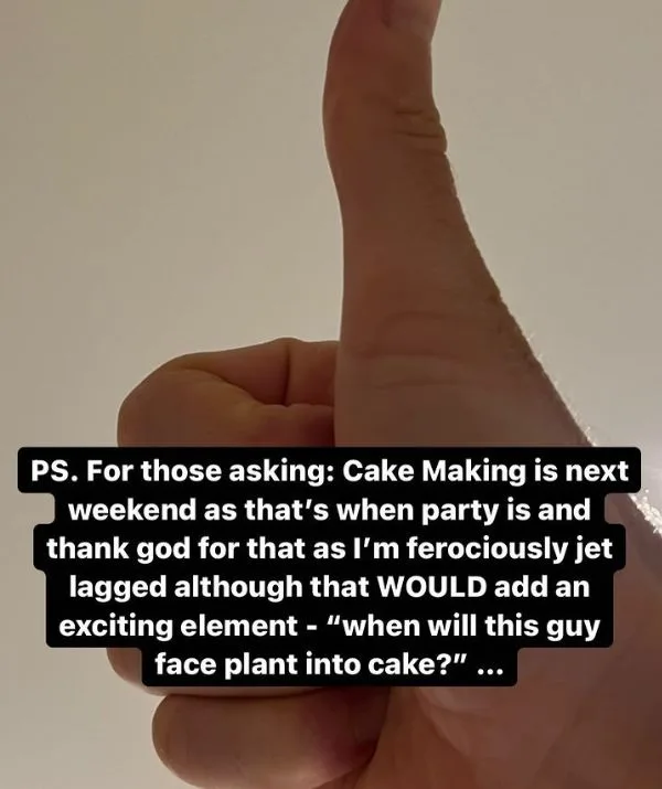 He shared a big thumbs up and wrote, “PS. For those asking: Cake making is next weekend as that’s when party is and thank god for that as I’m ferociously jet lagged although that WOULD add an exciting element – “when will this guy face plant into cake?”…”